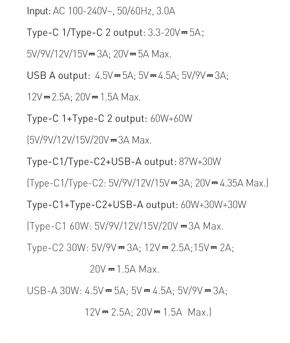 Type-C1 Output: 3.3-20V/5A,5V/3A,9V/3A,12V/3A,15V/3A,20V/5A Max.