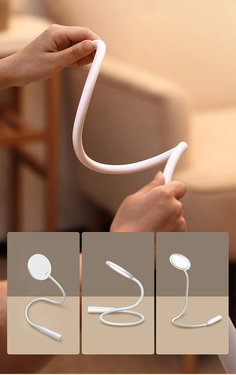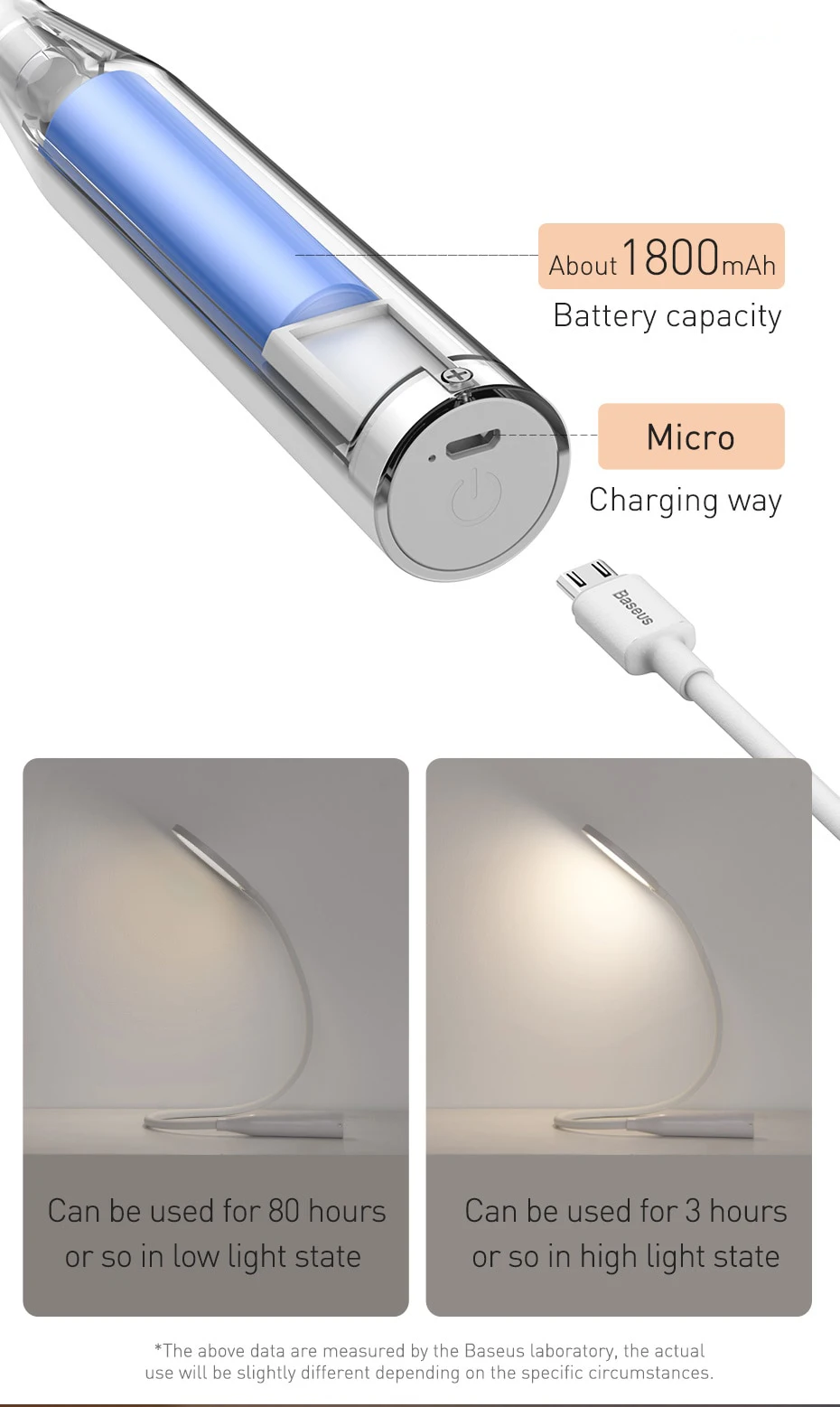 Brand: Baseus Name: Baseus Comfort Reading Uniform Light Hose Desk Lamp Material: ABS+PC+PMMA+Fe Color: White Weight: 330g Input voltage: 5V Power:4.5W Light source: LED Luminous flux: Greater than 20OLM Battery capacity: 1800mAh Color rendering index: 90