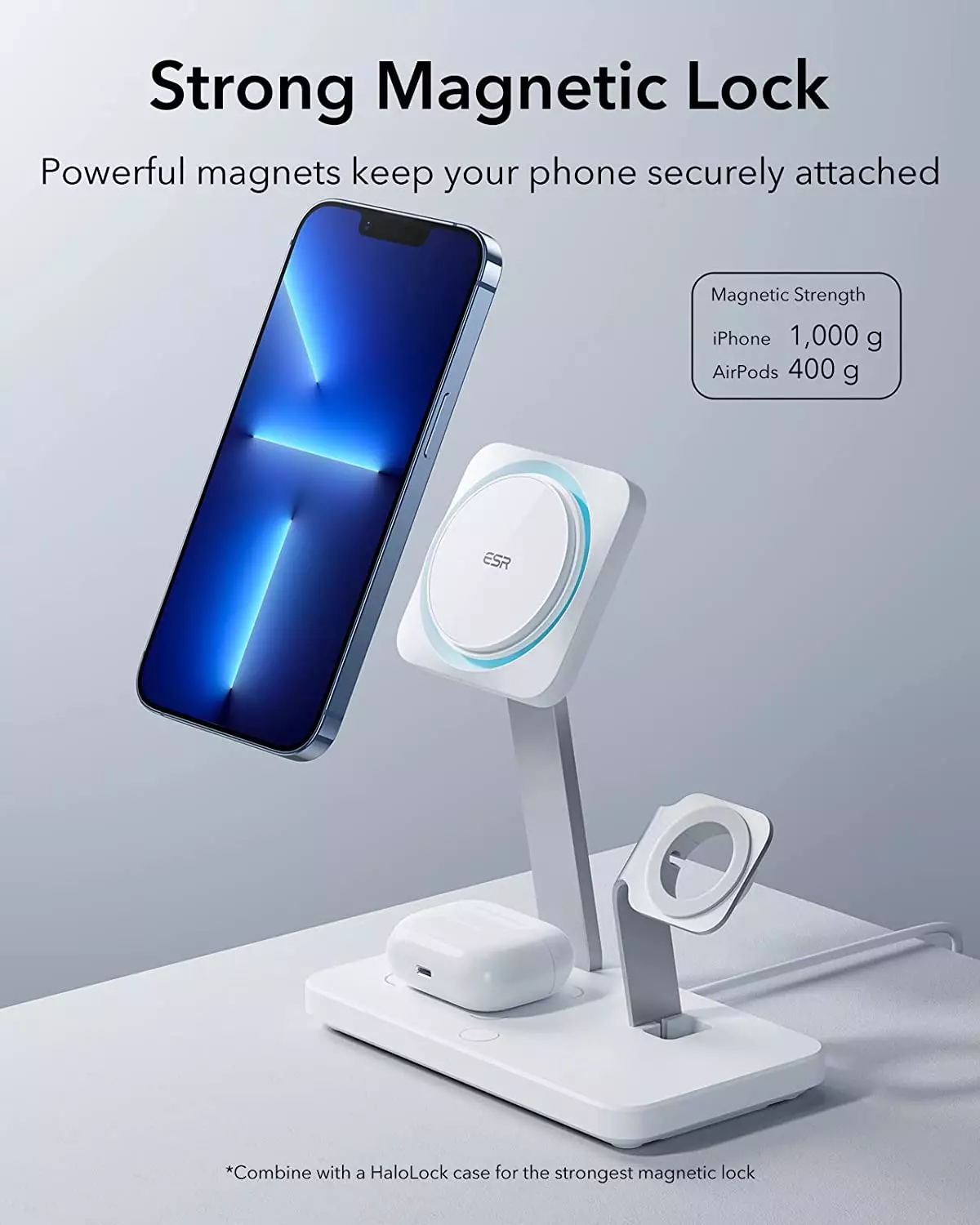 ESR HaloLock 3-in-1 Wireless Charger brings CryoBoost Fast Charging: phone-cooling fan and heat-dissipating tech combine to keep your phone cool and charging speeds at their maximum.
